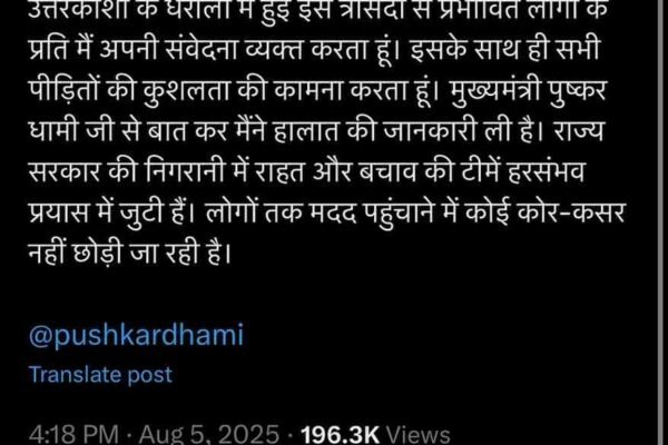 उत्तराखंड के उत्तरकाशी जिले के धराली गांव में मंगलवार को बादल फटने के कारण आई प्राकृतिक आपदा के बाद राहत और बचाव कार्य आज बुधवार, 6 अगस्त को भी लगातार जारी है। सेना, एनडीआरएफ, एसडीआरएफ और स्थानीय प्रशासन की टीमें संयुक्त रूप से प्रभावित क्षेत्र में राहत कार्यों में जुटी हैं। प्रदेश में बीते 48…