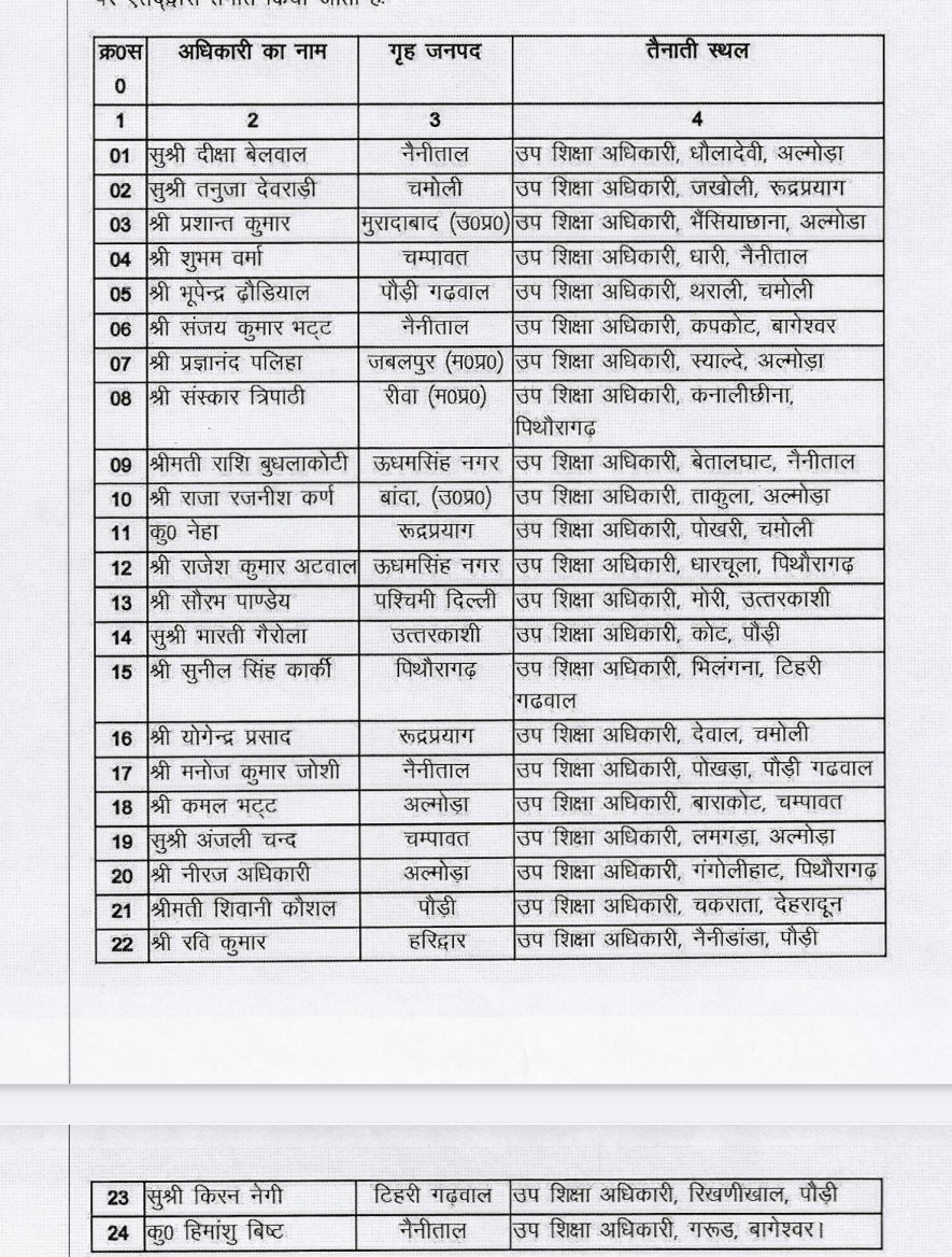 शिक्षा मंत्री डॉ. धन सिंह रावत ने बताया कि राज्य सरकार विद्यालयी शिक्षा व्यवस्था को और अधिक सुदृढ़ करने में जुटी है, इसके साथ ही प्रशासनिक व्यवस्थाओं में भी लगातार सुधार किये जा रहे हैं। जिसके तहत विभाग में शैक्षणिक, प्रशासनिक व शिक्षणेत्तर संवर्गों के रिक्त पदों को भरा जा रहा है। जिसके क्रम में राज्य लोक सेवा आयोग से चयनित 25 उप शिक्षा अधिकारियों को प्रशिक्षण पूर्ण करने के उपरांत प्रदेश के दूरस्थ क्षेत्र के विभिन्न विकासखण्डों में प्रथम तैनाती दे दी गई है। जिसमें अल्मोड़ा जनपद में सुश्री दीक्षा बेलवाल को धौलादेवी, प्रशांत कुमार को भैसियाछाना, प्रज्ञानंद पलिहा को स्याल्दे, राजा रजनीश कर्ण को ताकुला, सुश्री अंजली चंद को लमगड़ा विकासखण्ड में तैनाती दी गई है। इसी प्रकार रूद्रप्रयाग जनपद में सुश्री तनुजा देवराड़ी को जखोली, अजीत सिंह कर्णवाल को ऊखीमठ, नैनीताल जनपद के तहत शुभम वर्मा को धारी, राशि बुधलाकोटी को बेतालघाट, चमोली जिले में भूपेन्द्र ढ़ौंडियाल को थराली, नेहा को पोखरी, योगेन्द्र प्रसाद को देवाल, बागेश्वर जनपद के अंतर्गत संजय कुमार भट्ट को कपकोट, हिमांशु बिष्ट को गरूड़, पिथौरागढ़ जिले में संस्कार त्रिपाठी को कनालीछीना, राजेश कुमार अटवाल को धारचूला, नीरज अधिकारी को गंगोलीहाट, उत्तरकाशी में सौरभ पाण्डेय को मोरी, पौड़ी में सुश्री भारती गैरोला को कोट, मनोज कुमार जोशी को पोखड़ा, रवि कुमार को नैनीडांडा, सुश्री किरन नेगी को रिखणीखाल, टिहरी जनपद में सुनील सिंह कार्की को भिलंगना, चम्पावत जिले में कमल भट्ट को बाराकोट और देहरादून जनपद में शिवानी कौशल को चकराता विकासखण्ड में उप शिक्षा अधिकारी के पद पर तैनाती दी गई है। विभागीय मंत्री ने कहा कि नव नियुक्त उप शिक्षा अधिकारियों की तैनाती से दूरस्थ क्षेत्रों की शिक्षा व्यवस्था और मजबूत होगी साथ ही विभागीय कार्यों में भी तेजी आयेगी। उन्होंने सभी नवनियुक्त उप शिक्षा अधिकारियों को बधाई दी, साथ ही उन्होंने उम्मीद जताई कि नवनियुक्ति अधिकारी अपने कार्यों व दायित्वों का निर्वहन पूरी निष्ठा व ईमानदारी के साथ करेंगे।
